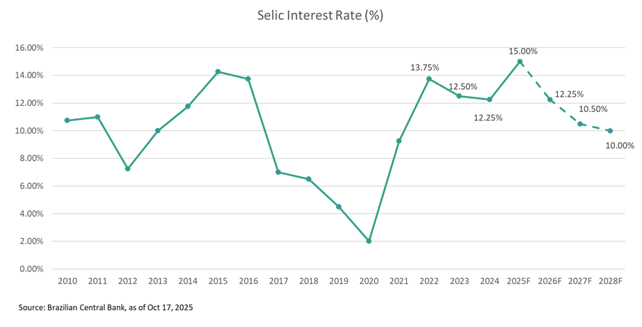 Under a tight monetary policy, with record-high SELIC interest rates of 15%, Brazil’s economy is expected to have grown by around 0.3% in the quarter,[21] with a full-year growth projected by Brazilian Central Bank at 2.0%.[22] While the SELIC rate remains elevated, there may be an interest rate cut if inflation continues to ease. Current forecasts indicate the rate will gradually decline to 12.25% in 2026 and further to 10% by 2028. Inflation forecasts for 2025 and 2026 stand at 4.80% and 3.60%[23], respectively, suggesting a cautiously optimistic outlook that Brazil’s macroeconomic environment may be on a path toward stabilization in the medium term.